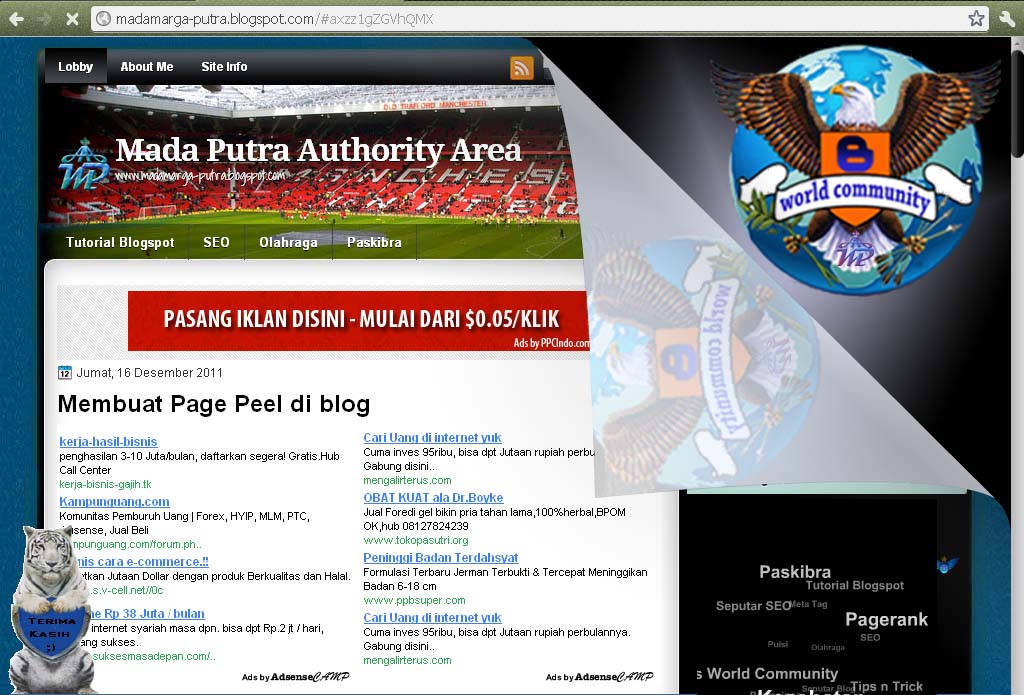 Sesuai di postinganku sebelumnya "Bloggers World Community" kali ini aku akan membahas cara membuat page peel. Page peel adalah sebuah animasi yg akan menggulung sebagian tampilan blog kita sebelah atas pojok kanan. Page peel ini saya buat sebagai lambang klo kita nantinya satu komunitas di Bloggers World Community. Langsung aja kita bahas cara membuatnya,
